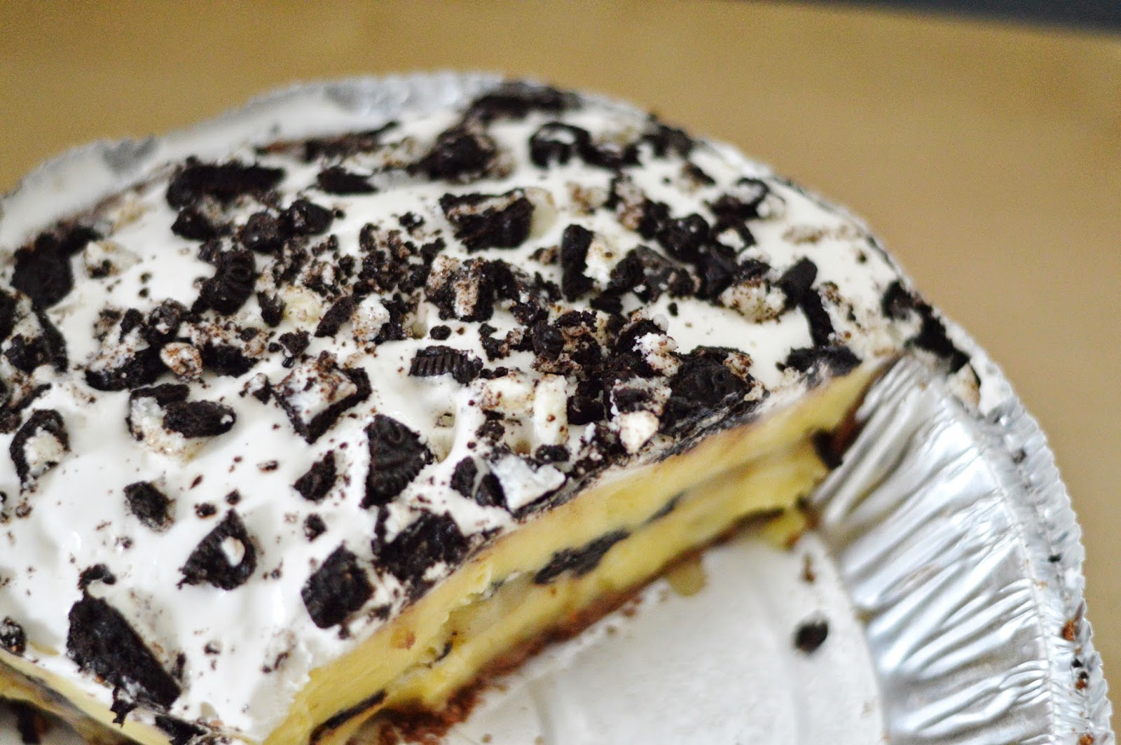Fast forward to baking day and I discover that most of the Oreos for the "dirt" cake were missing. Ah-hem, husband...guess you didn't want that cake THAT bad. Since I had some of the Oreos plus all of the ingredients for the banana cream pie, I decided to sort of combine the two. Wow, SO glad some of the cookies went missing - this pie is amazing!
